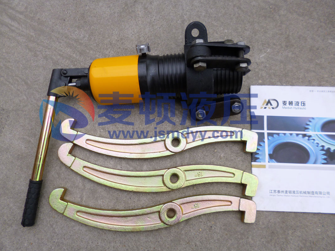 液壓拉馬是以液壓起動桿直接前進移動,故推動桿本身不作轉動。鉤爪座又可隨螺紋直接作前進后退之調距,操作時只要把手前后小幅度擺動,油壓起動桿前移,鉤爪相對應后退,把被拉物體拉出。